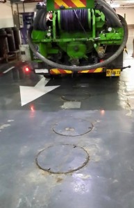 משאית ביובית בעבודת שאיבות ביוב בחניון